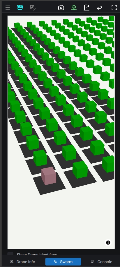 Much like the Console, Verge Remote allows the user to visualize their fleet both as a flat list and as a 3-dimensional projection of the launchpad grid to help assess and troubleshoot issues when setting up your grid via the 'Swarm' tab. Icons in the top left allow you to swap between the list view, the 360 3D view, and a Satellite view to help you orient yourself to your fleet.