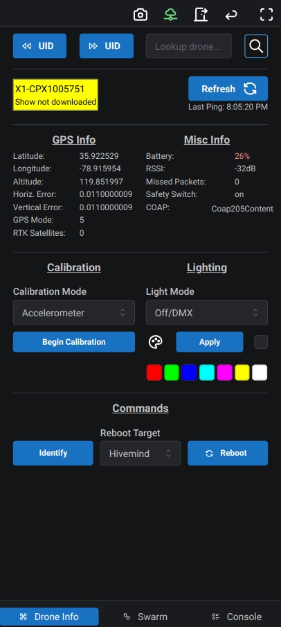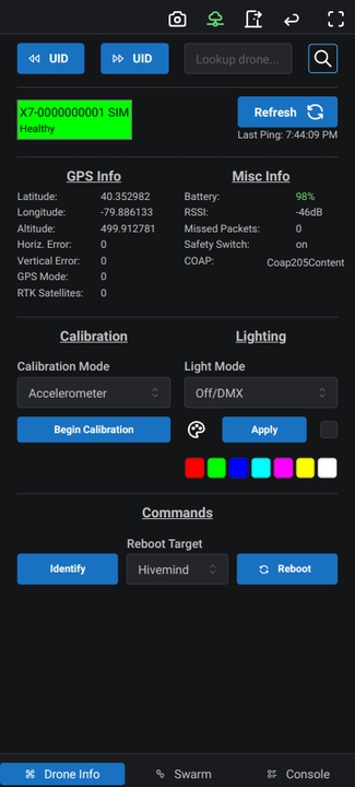 Clicking on a drone in the 'Swarm' tab, whether through the list or the 3D tiles will take you to the Drone Info page which allows you to see health information on the drone, including live status updates. The user can additionally calibrate the drones in 4 different modes: Accelerometer, Gyroscope, Compass, and Level. Additionally, the user can change the drone's light modes including turning lights on or off which can be useful when setting up launchpad grids to pick out problem drones. Drones can also be rebooted via this page.