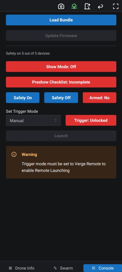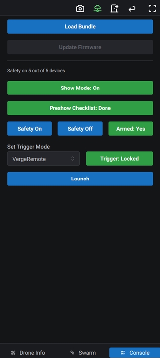 On the Console tab, you can see a live view into the state of various items in the Console pre-show, such as show mode, the preshow checklist, armed status, trigger lock state, etc. These will let you run through the pre-show items necessary to launch your show if desired, freeing you up to move through your fleet as necessary instead of being stuck at your Console computer.